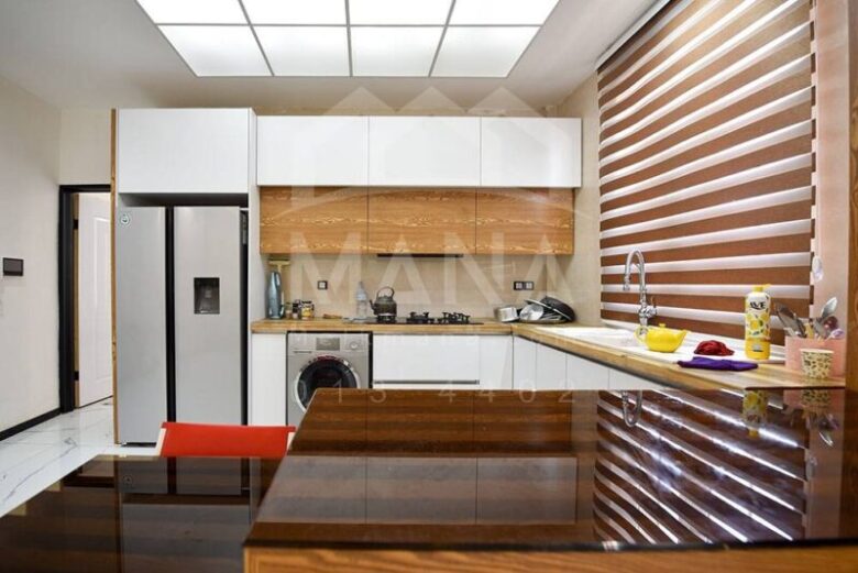 آشپزخانه ای مدرن با کابینت هایی ترکیب شده از هایگلاس و MDF طرح چوب و ترمو وود، هود و گاز رومیزی جلوه ای بسیار زیبا و جذاب به این ویلا داده است. ضمن اینکه یک پنجره بزرگ نورگیری آشپزخانه را دوچندان کرده است.